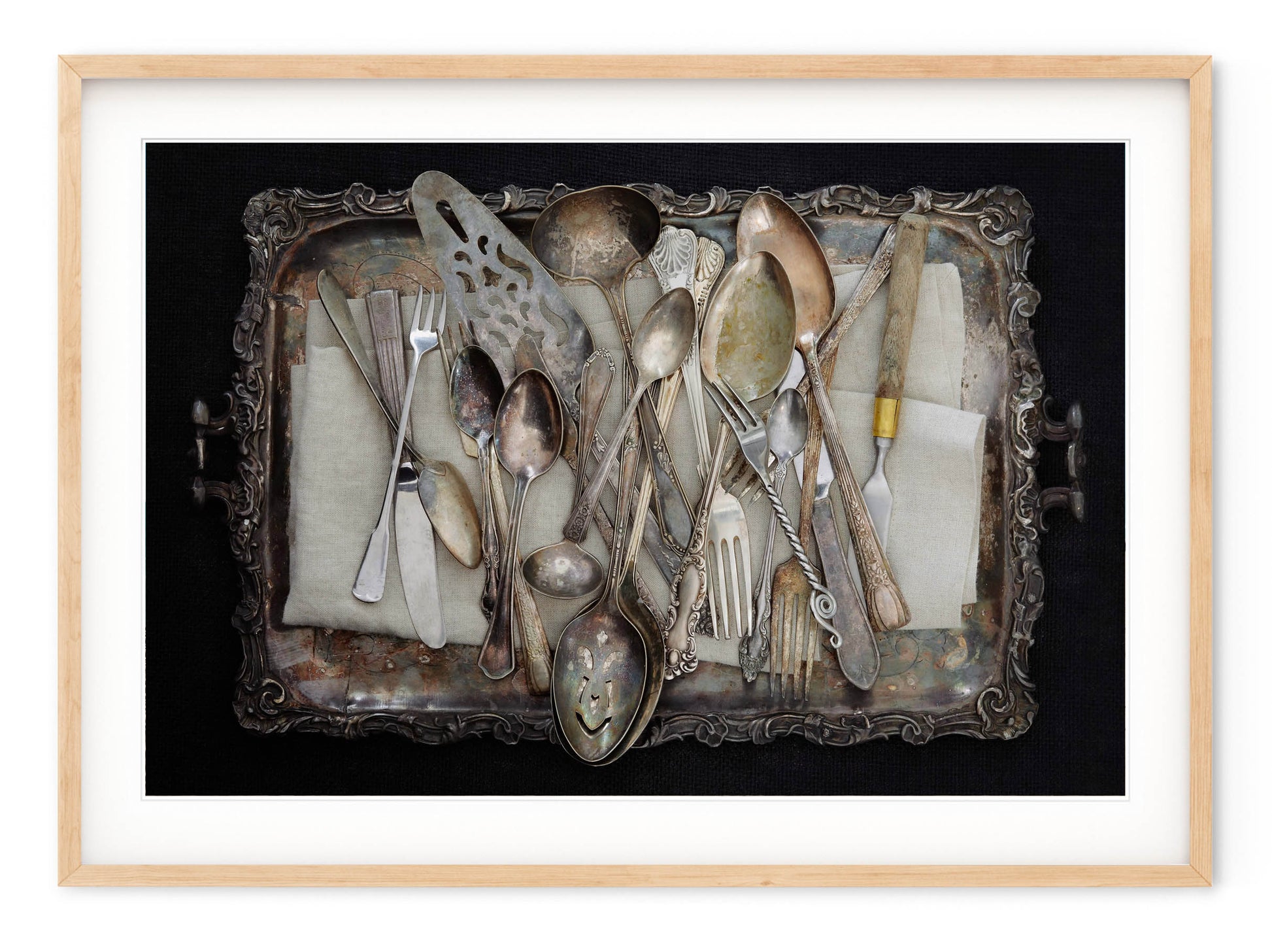 Description: Tray of antique silver cutlery and linen napkin with slight watercolor effect.