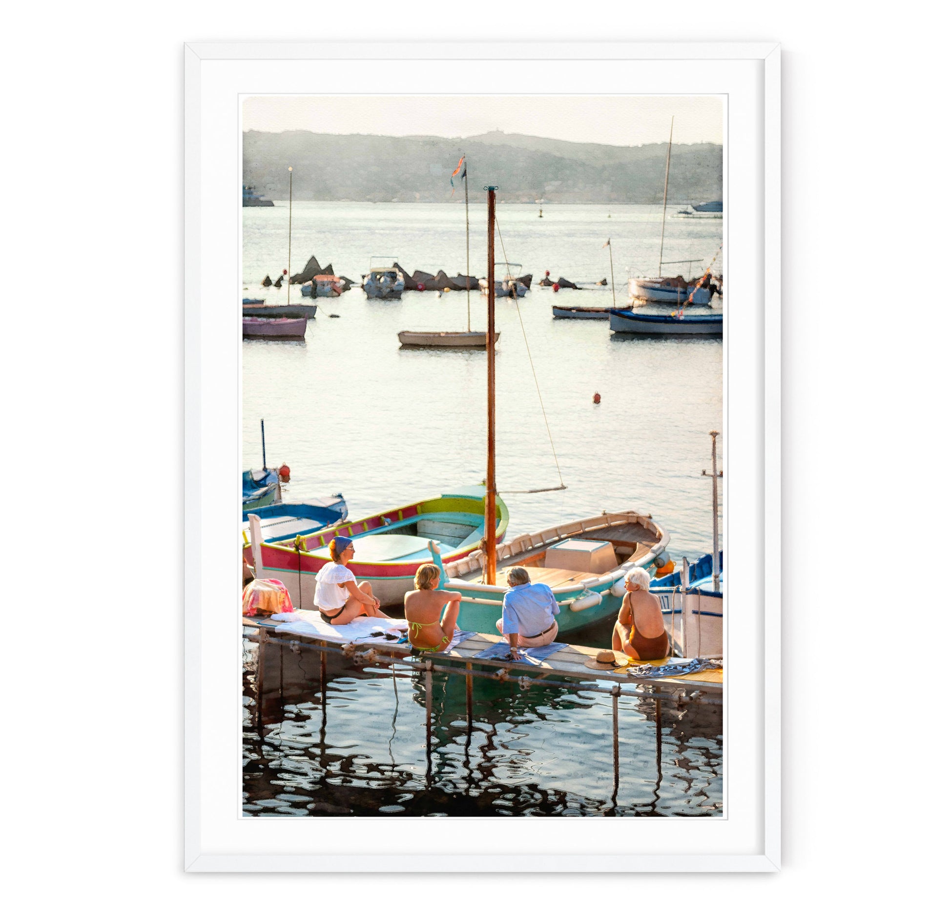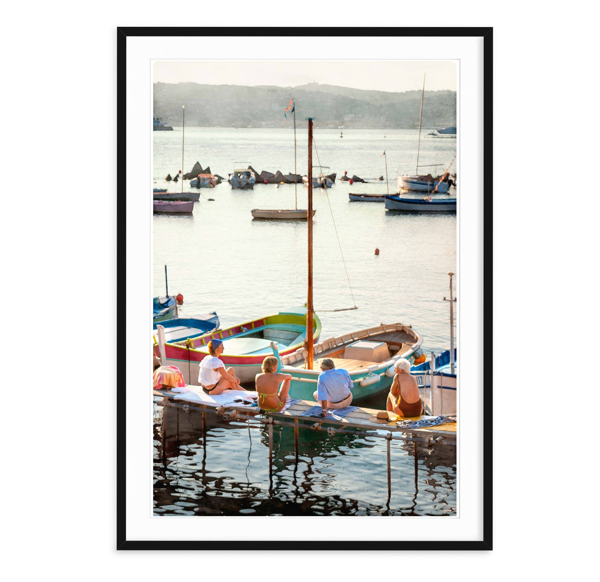 Description: Landscape of friends relaxing on pier after a day sailing the Mediterranean in Cap d'Antibes, France.