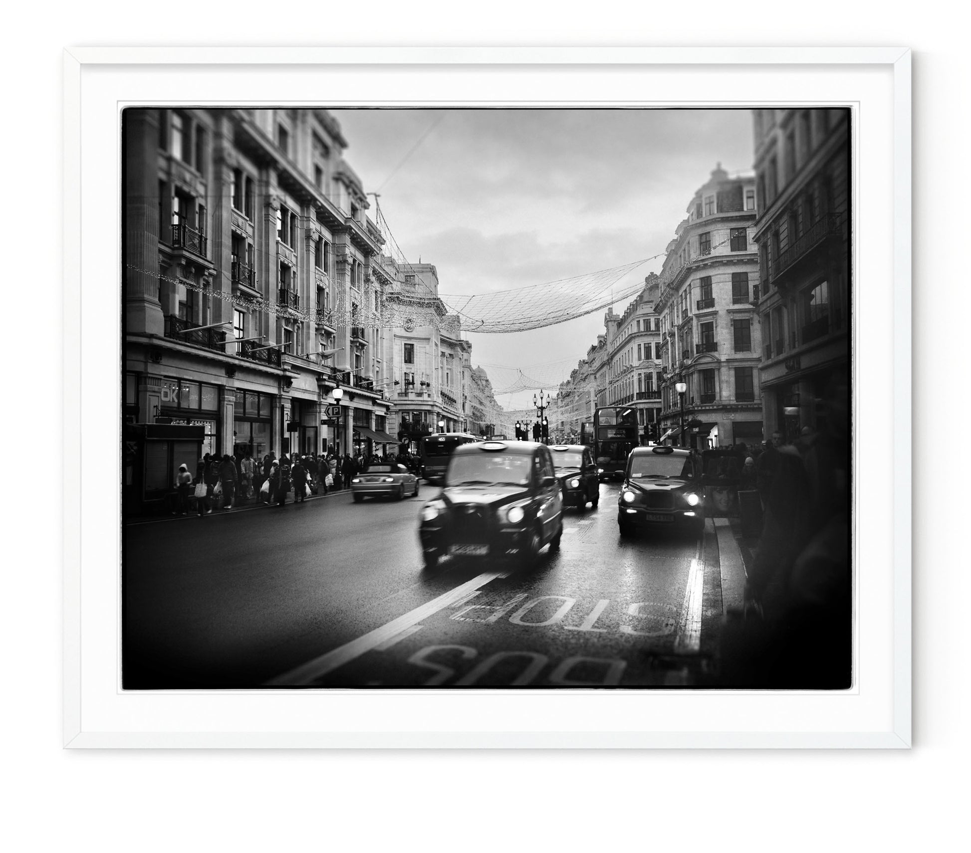 Description: Street scene of black cabs on Regent Street in London. Shot on film with film edge visible.