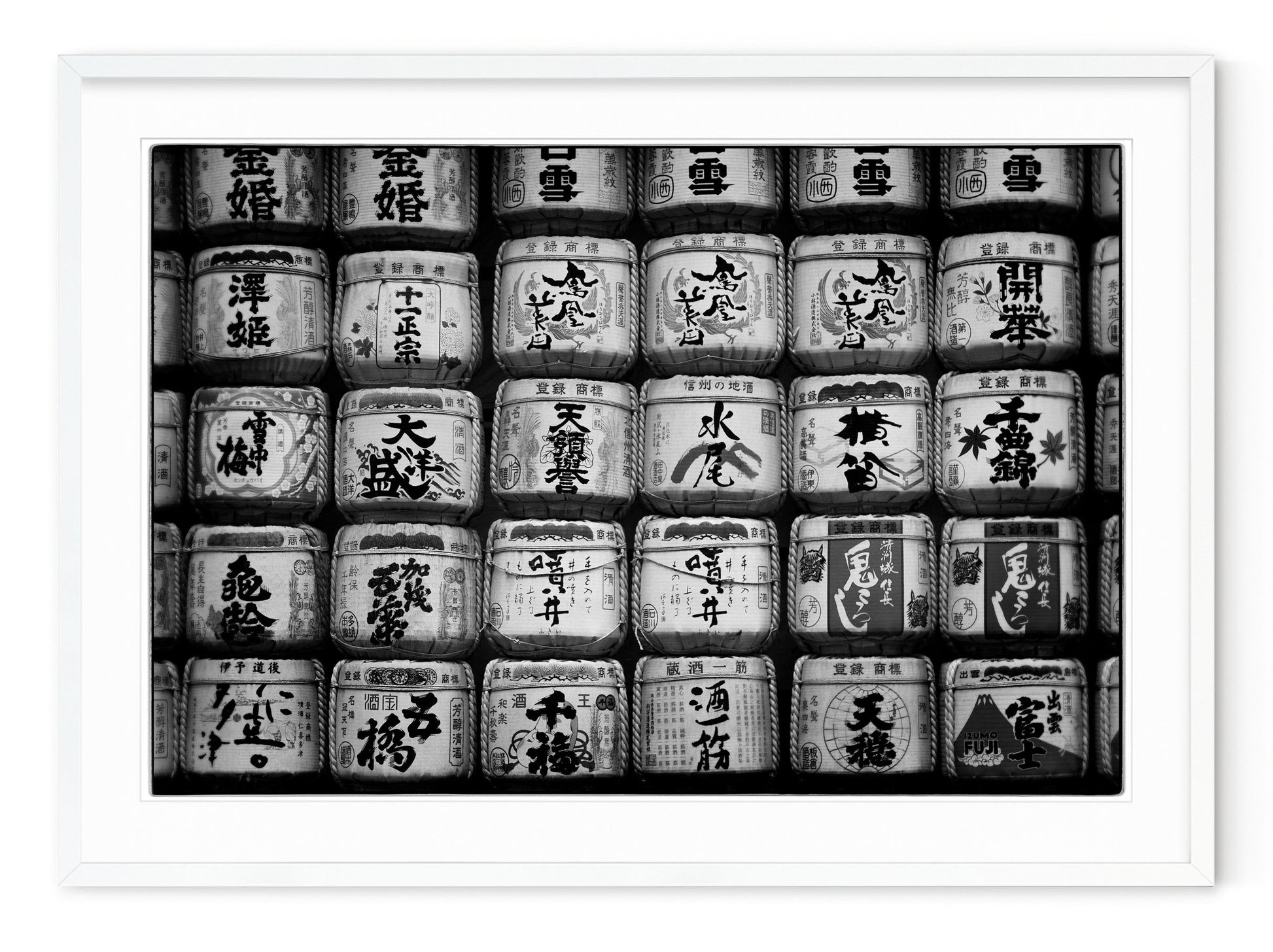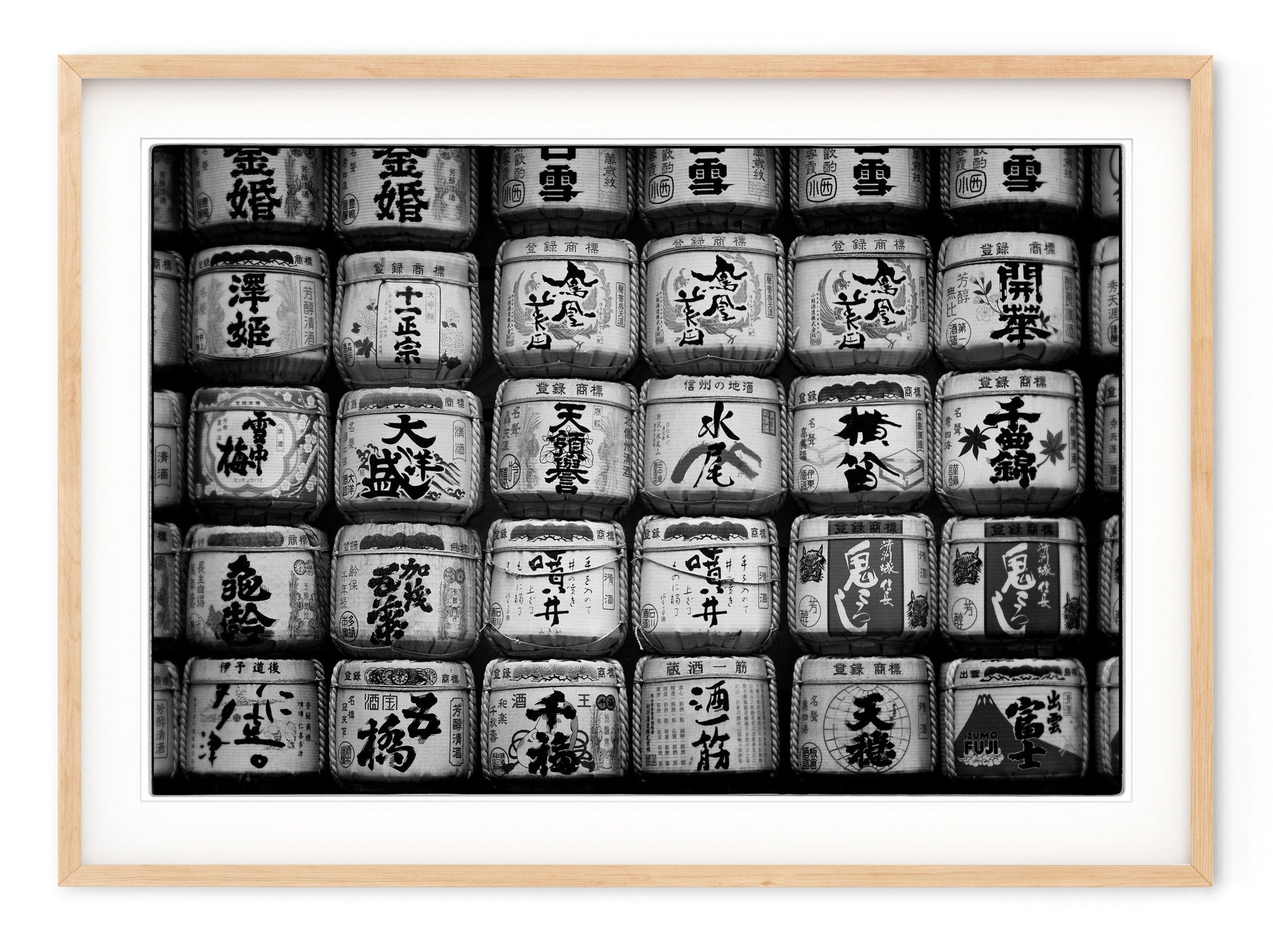 Description: Graphic composition of saké barrels shot in Tokyo, Japan. Shot on film with film edge visible.