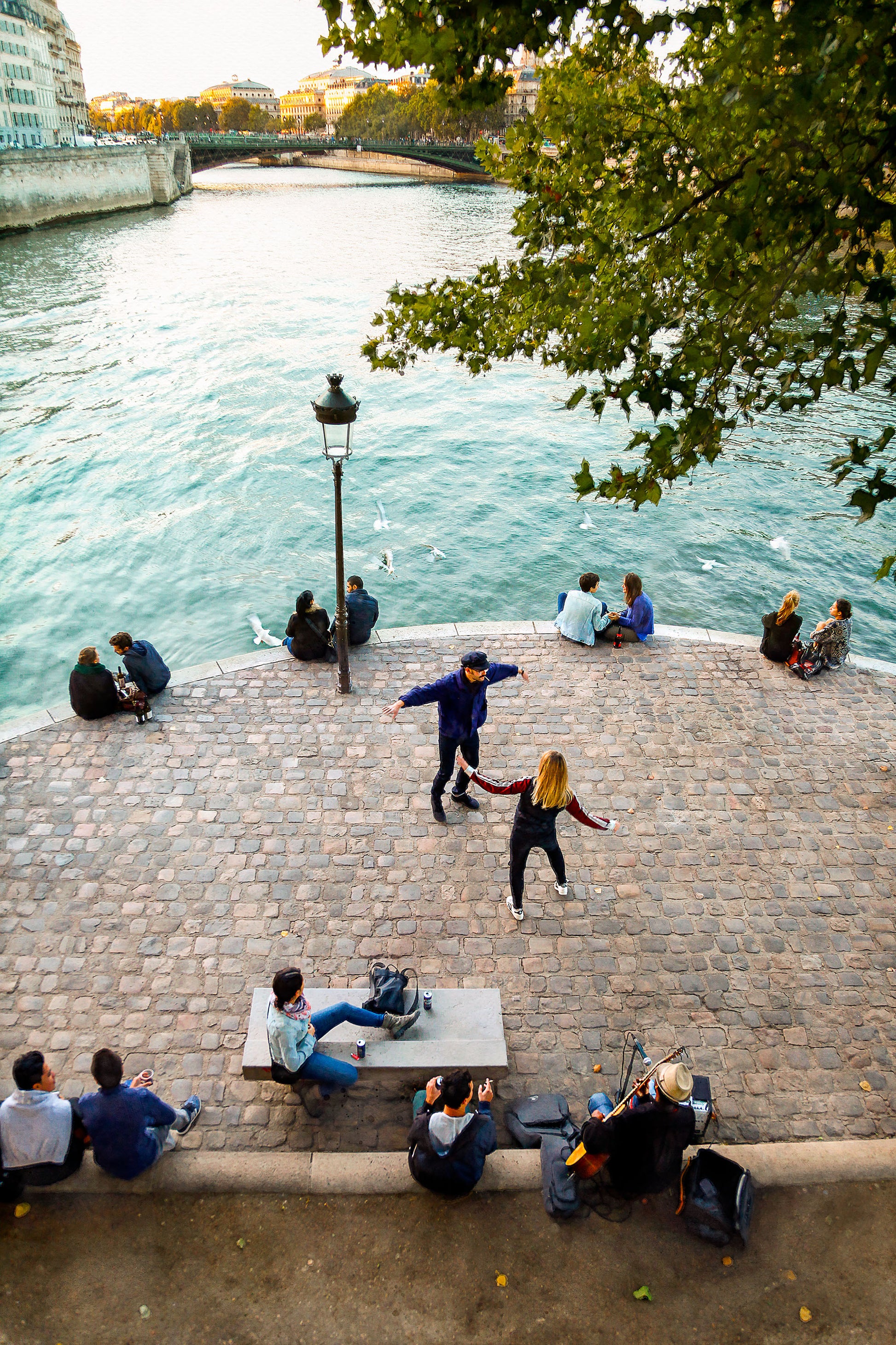 Description: Parisians have an after work party on the Seine. Watercolor, mixed media art.