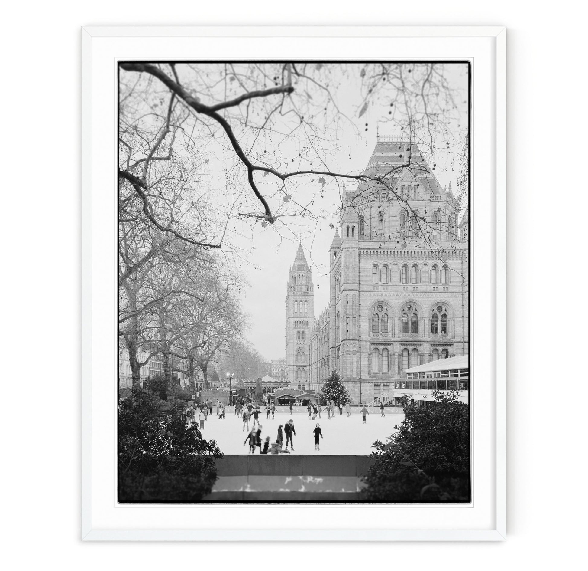 Description: Ice skaters enjoy the rink at London's Natural History Museum. Shot on film with film edge visible.