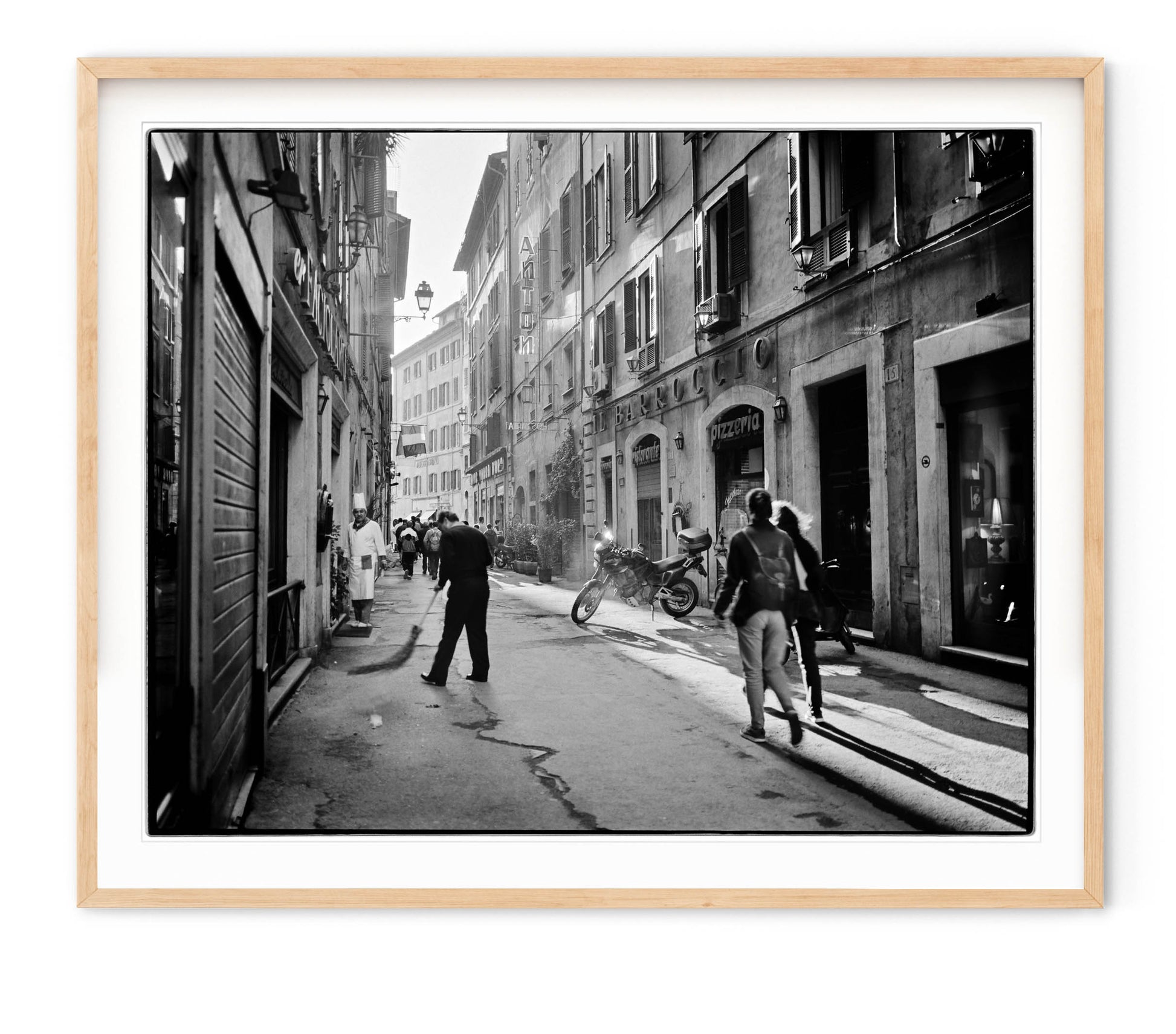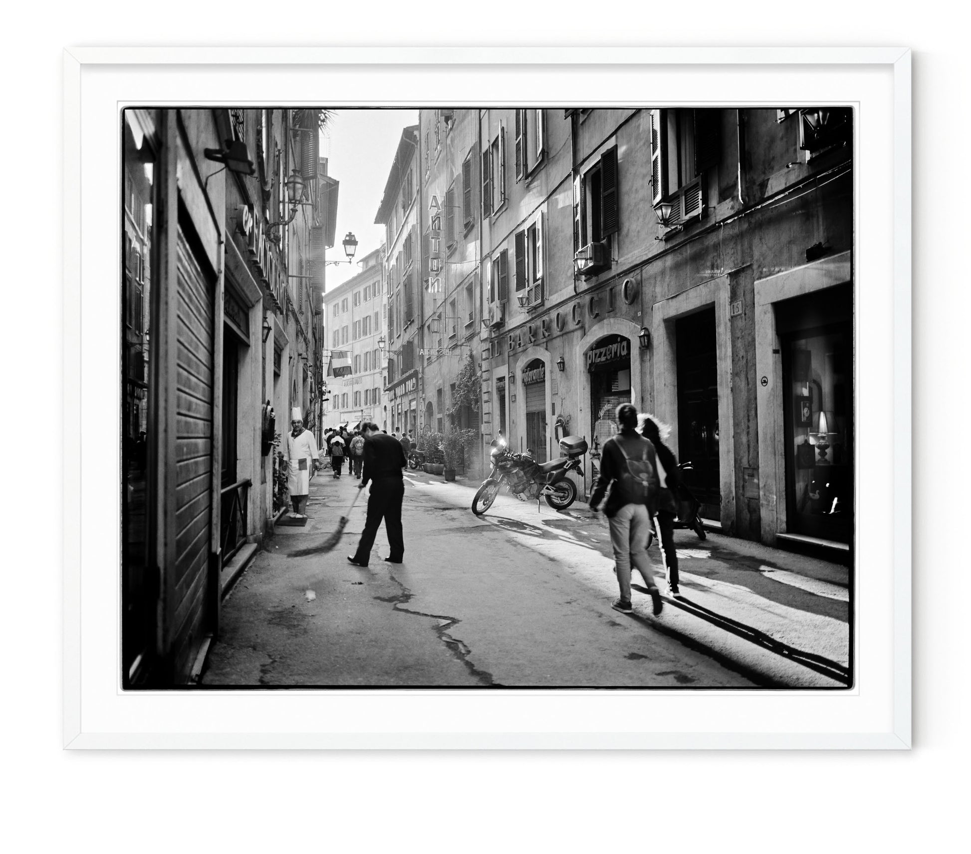 Description: Street scene of a Roman neighborhood with people enjoying a late afternoon stroll. Shot on film with film edge visible.