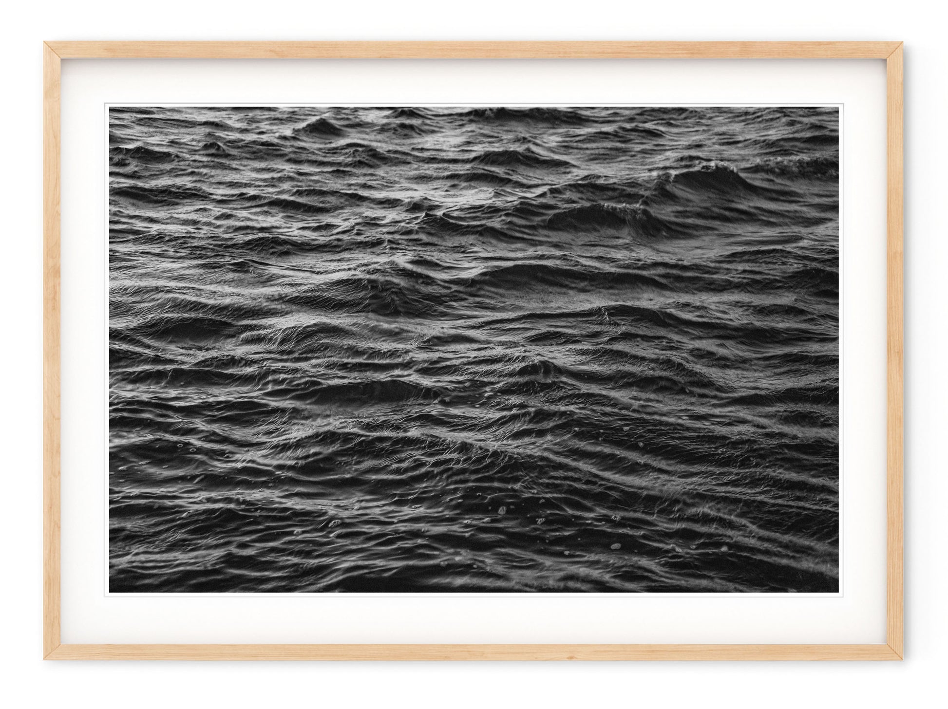 Description: Graphic seascape of moving waves in moonlit black ocean.