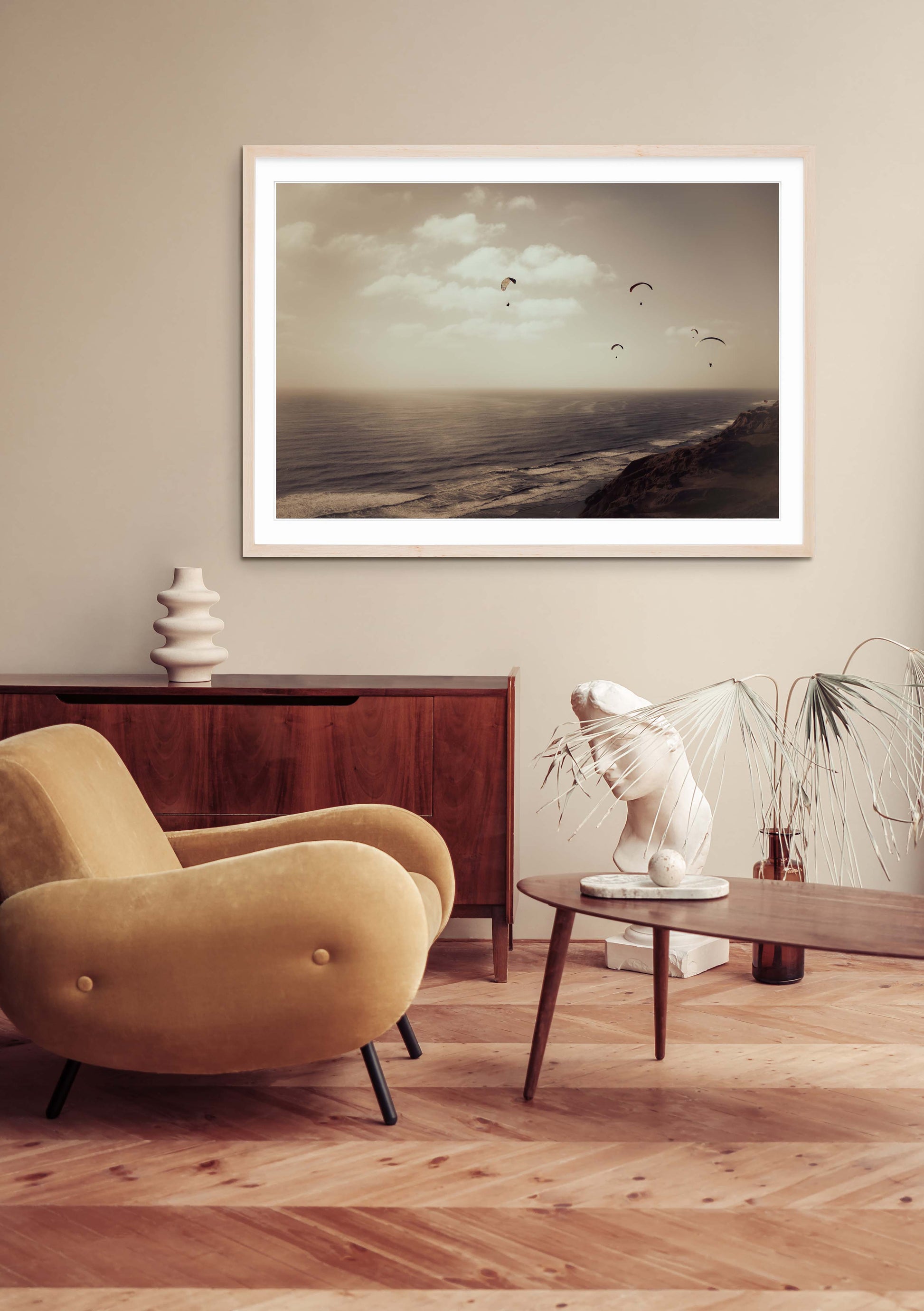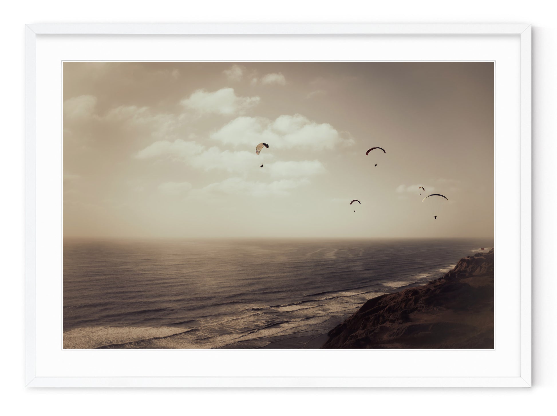Description: Dramatic coastal landscape with paragliders soaring in the sky.