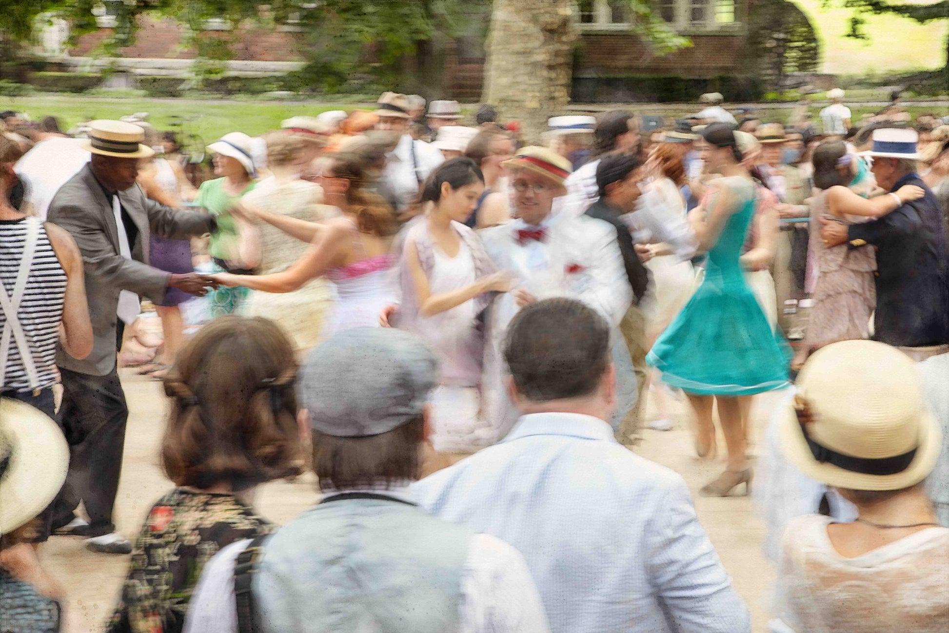 Description: People dance in colorful 1920s attire at a theme party. Watercolor effect.