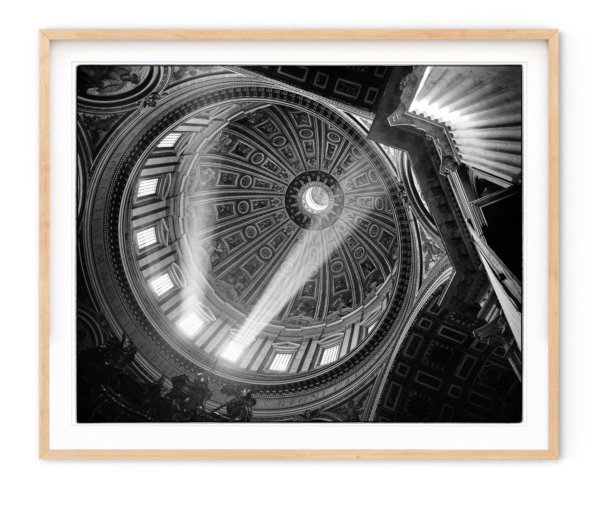 Description: Beams of light cross the dome of St. Peter's in Rome, Italy. Shot on film with film edge visible.